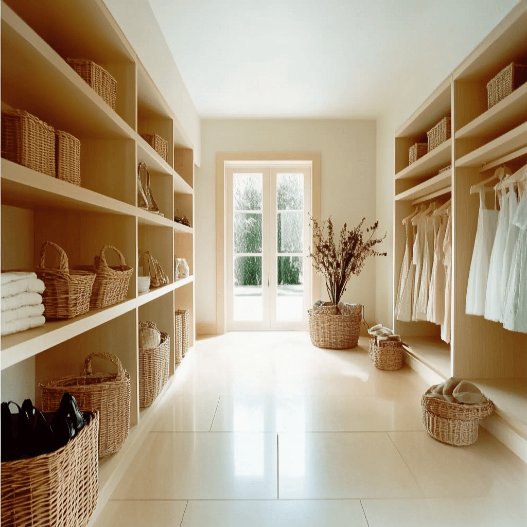 컬러를 통일하면 드레스룸이 넓어 보이는 효과도 얻을 수 있습니다. 특히 작은 드레스룸에서는 밝은 색감을 사용하는 것이 공간감을 확보하는 데 유리합니다.